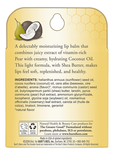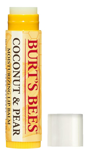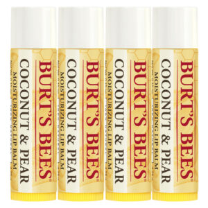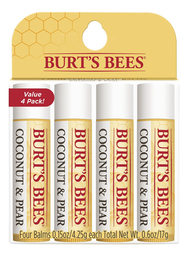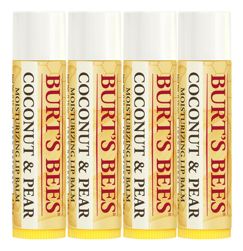 Bálsamo labial hidratante 100% natural Burts Bees, coco e pera com cera de abelha e extratos de frutas, 4 tubos