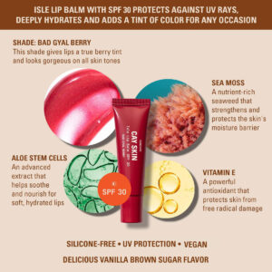 Um protetor labial hidratante e protetor com proteção UVA/UVB que dá aos lábios um verdadeiro tom de frutas vermelhas, lindo em todos os tons de pele. O protetor labial Isle oferece um acabamento moderno, de alto brilho e não pegajoso e é formulado com o mesmo sabor de açúcar mascavo de baunilha que você adora no original. – FÓRMULA HIDRATANTE: Um protetor labial diário hidratante e protetor com proteção UVA/UVB que deixa um acabamento claro e não pegajoso com uma barreira de umidade para uma suavidade duradoura – PROTEÇÃO SOLAR: ingredientes ricos em nutrientes, como células-tronco de aloe, musgo marinho e vitamina E hidrata, suaviza e fortalece os lábios enquanto oferece horas de proteção solar com SPF 30 – TINTED: Isle Lip Balm oferece um protetor labial moderno e de alta qualidade brilho, acabamento não pegajoso e é formulado com o mesmo sabor de açúcar mascavo de baunilha que você adora no original. Essa tonalidade dá aos lábios uma verdadeira tonalidade de frutas vermelhas e fica linda em todos os tons de pele – INGREDIENTES PRINCIPAIS: Sea Moss – Uma alga marinha rica em nutrientes que ajuda a fortalecer e proteger a barreira de umidade da pele. Células-tronco de aloe vera: um extrato avançado de células-tronco de aloe vera que ajuda a aliviar a vermelhidão e a irritação enquanto nutre os lábios macios e hidratados. Vitamina E: Um poderoso antioxidante que protege a pele dos danos causados pelos radicais livres – CUIDADO LABIAL: Aplique uniformemente nos lábios 15 minutos antes da exposição ao sol. Reaplique ao longo do dia.