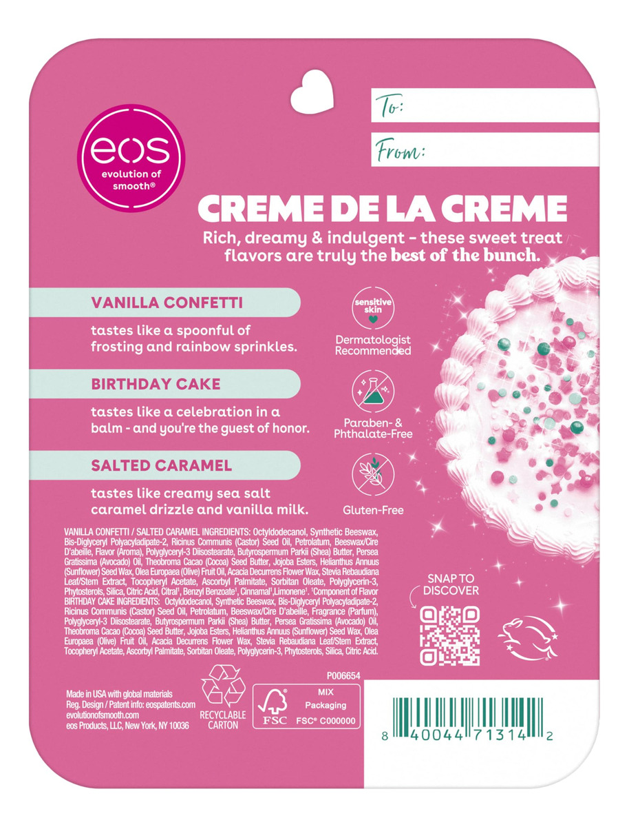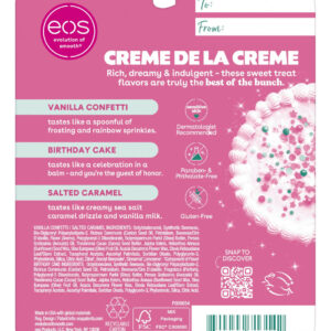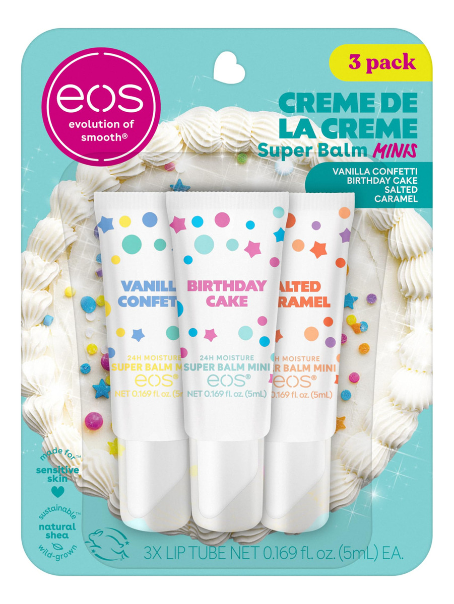 eos 24H Moisture Super Balm Minis- Crme de la Crme, máscara labial de edição limitada, pacote variado, 0,169 fl oz, pacote com 3 — CRME DE LA CRME: este conjunto de 3 contém sabores ricos, sonhadores e indulgentes, como bolo de aniversário, confete de baunilha e caramelo salgado — hidratação 24 horas: nossos superbálsamos são feitos com 3 manteigas hidratantes: cacau, karité e abacate que condiciona e protege profundamente seus lábios para um tratamento diurno ou noturno — FEITO PARA PELES SENSÍVEIS: Nosso protetor labial recomendado por dermatologistas é formulado para peles sensíveis e hipoalergênicas — INGREDIENTES DE ORIGEM SUSTENTÁVEL: Os protetores labiais eos têm manteiga e óleo de karité naturais cultivados de forma selvagem e de origem sustentável para deixar seus lábios macios e nutridos – NOSSA PROMESSA: Todos os protetores labiais eos são livres de parabenos, ftalatos, glúten e crueldade