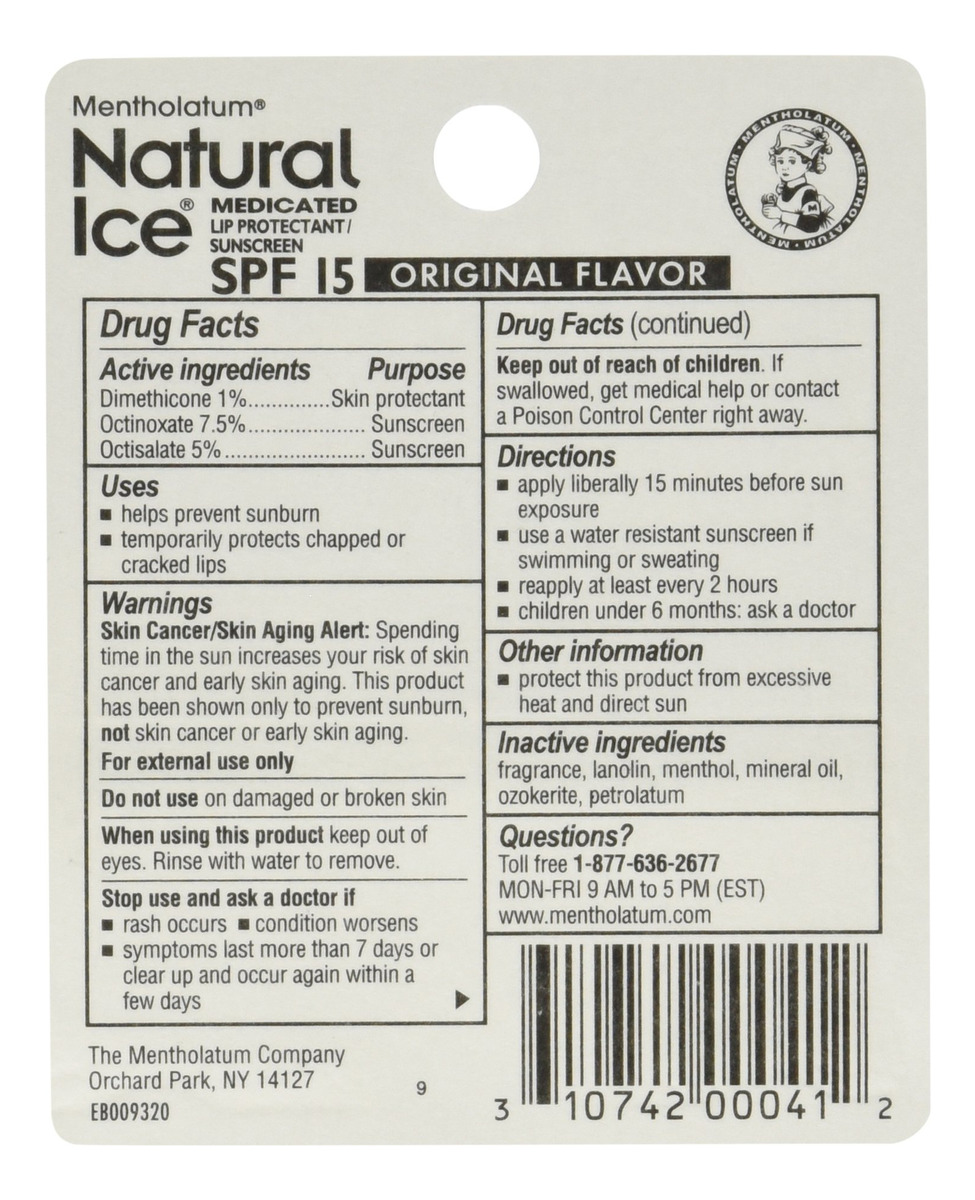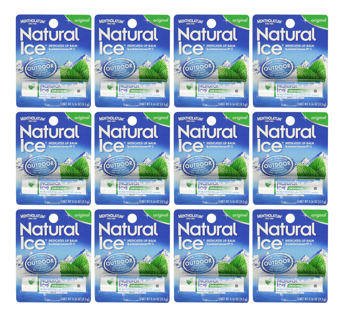 Protetor solar protetor labial Mentholatum Natural Ice Medicated, 0,16 onças (pacote com 12) — O protetor labial natural Ice é refrescante e suavizante. — 12 unidades — Estilo natural com gelo