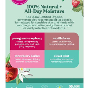 Descubra um protetor labial 100% natural, orgânico e delicioso. Este pacote de 4 inclui sabores de sorvete de morango, hortelã doce, romã e framboesa e baunilha.
