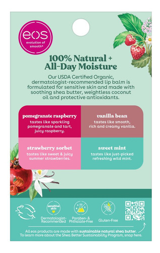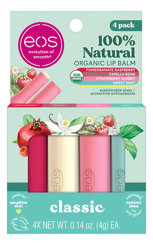 Bálsamos labiais eos 100% naturais e orgânicos: sorvete de morango, baunilha, menta doce e produtos para o cuidado labial de romã e framboesa, 0,14 onças (pacote com 4)