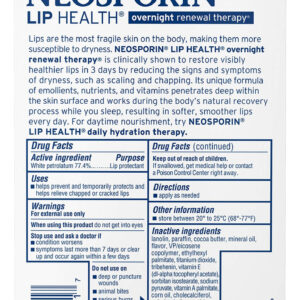 Terapia de renovação noturna Neosporin Lip Health, 5 unidades – RENOVAÇÃO NOTURNA: contém uma mistura única de antioxidantes e lipídios essenciais que atuam enquanto você dorme para hidratar e nutrir profundamente os lábios, restaurando sua suavidade e elasticidade naturais – Profundamente nutritivo: formulado com vaselina branca, uma barreira oclusiva que ajuda a reter a umidade e proteger seus lábios dos elementos – FORTALECE OS LÁBIOS: contém peptídeos e emolientes que ajudam a reter a umidade e proteger seus lábios dos elementos para fortalecer a barreira natural dos lábios e evitar maiores danos – HIDRATAÇÃO DE LONGA DURAÇÃO: contém vitaminas e hidratantes que ajudam a manter os lábios confortáveis e protegidos durante todo o dia – MELHORA O TOM DOS LÁBIOS: melhora o tom geral e a textura dos lábios, deixando-os com aparência e sensação mais saudáveis e radiantes