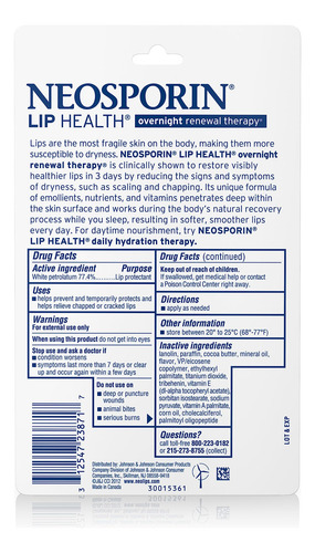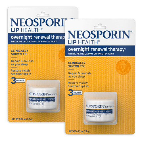 Terapia de renovação noturna Neosporin Lip Health, 0,27 onças, pacote com 2 – Pacote duplo contendo dois tubos de 0,27 onças de 0,27 onças de protetor labial Neosporin Lip Health Overnight Renewal Therapy para ajudar a hidratar e nutrir a pele mais frágil do corpo – Este tratamento labial noturno reduz os sinais e sintomas de ressecamento, como descamação, rachaduras e rachaduras, e está clinicamente comprovado que restaura lábios visivelmente mais saudáveis em apenas 3 dias – Especialmente formulado com vaselina branca e lipídios essenciais, o tratamento hidratante funciona enquanto você dorme para se hidratar profundamente e ficar mais macio, lábios mais lisos — Contém uma mistura única de vitaminas e hidratantes para ajudar a reparar e nutrir os lábios, bem como peptídeos e emolientes para ajudar a fortalecer seus lábios — Este hidratante labial noturno penetra profundamente na superfície da pele para trabalhar com o processo de recuperação natural do corpo e não contém sabores artificiais e não contém parabenos e conservantes