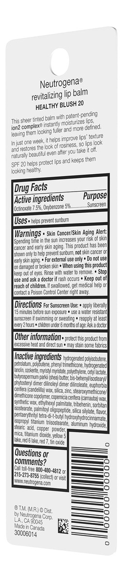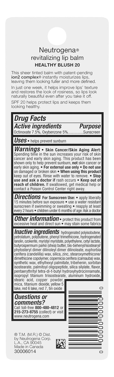 Descrição do produto Refresque a aparência de seus lábios com o protetor labial revitalizante Neutrogena com SPF 20. Em apenas uma semana de uso, esse bálsamo transparente e colorido ajuda a melhorar a textura e a cor dos lábios, realçando sua tonalidade natural e adicionando um leve tom de cor. O bálsamo hidratante restaurador ajuda a reparar a aparência dos lábios secos e rachados para promover uma aparência mais saudável e rosada, para que fiquem naturalmente bonitos, mesmo sem o bálsamo. A fórmula deste bálsamo hidratante inclui Ion2Complex para hidratar instantaneamente os lábios, deixando-os com uma aparência mais cheia e definida. O bálsamo reparador labial também oferece a defesa solar do protetor solar SPF 20 de amplo espectro, que ajuda a proteger contra queimaduras solares e ajuda a manter os lábios com aparência saudável. Para melhorar ainda mais a aparência de seus lábios, dê brilho com um pouco do Neutrogena MoistureShine Tinted Lip Soother Gloss. História da marca Neutrogena Cosmetics