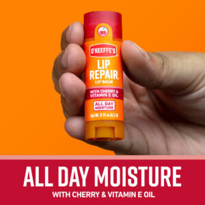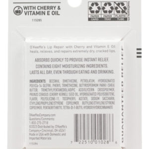 Bálsamo labial O'Keeffe's Lip Repair com óleo de cereja e vitamina E, em bastão (pacote com 3) — O reparador labial O'Keeffe's com óleo de cereja e vitamina E cura, alivia e repara lábios extremamente secos e rachados — Contém oito ingredientes hidratantes — Cria uma barreira flexível que se move com os lábios para ajudar a manter os lábios secos e rachados protegidos — Dura o dia todo, mesmo comendo e bebendo — Absorve rapidamente para proporcionar alívio instantâneo