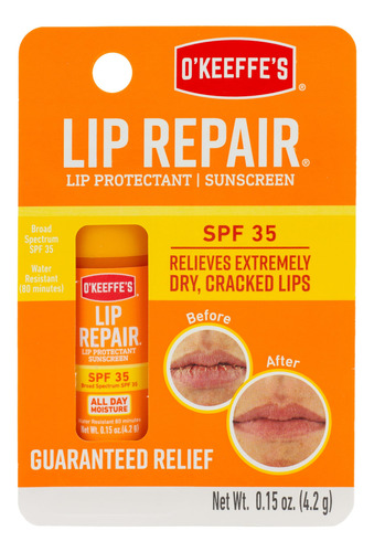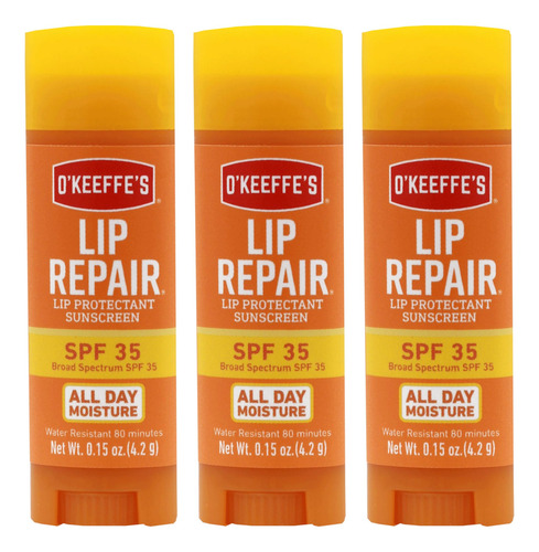 Bálsamo labial O’Keeffe’s Lip Repair SPF 35 (pacote com 3) — Este protetor labial altamente eficaz cura, alivia e repara lábios extremamente secos e rachados — Oferece alívio instantâneo e umidade durante todo o dia em 1 uso — Cria uma barreira flexível para curar lábios secos e rachados; 80 minutos de resistência à água — Protege contra o ressecamento durante todo o dia, mesmo quando você come e bebe — Absorve rapidamente para proporcionar lábios macios e macios; acabamento fosco