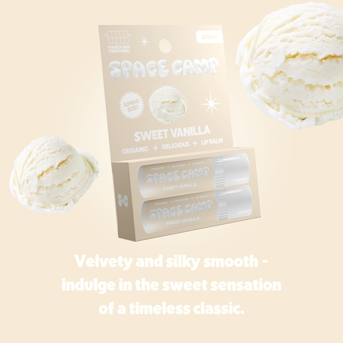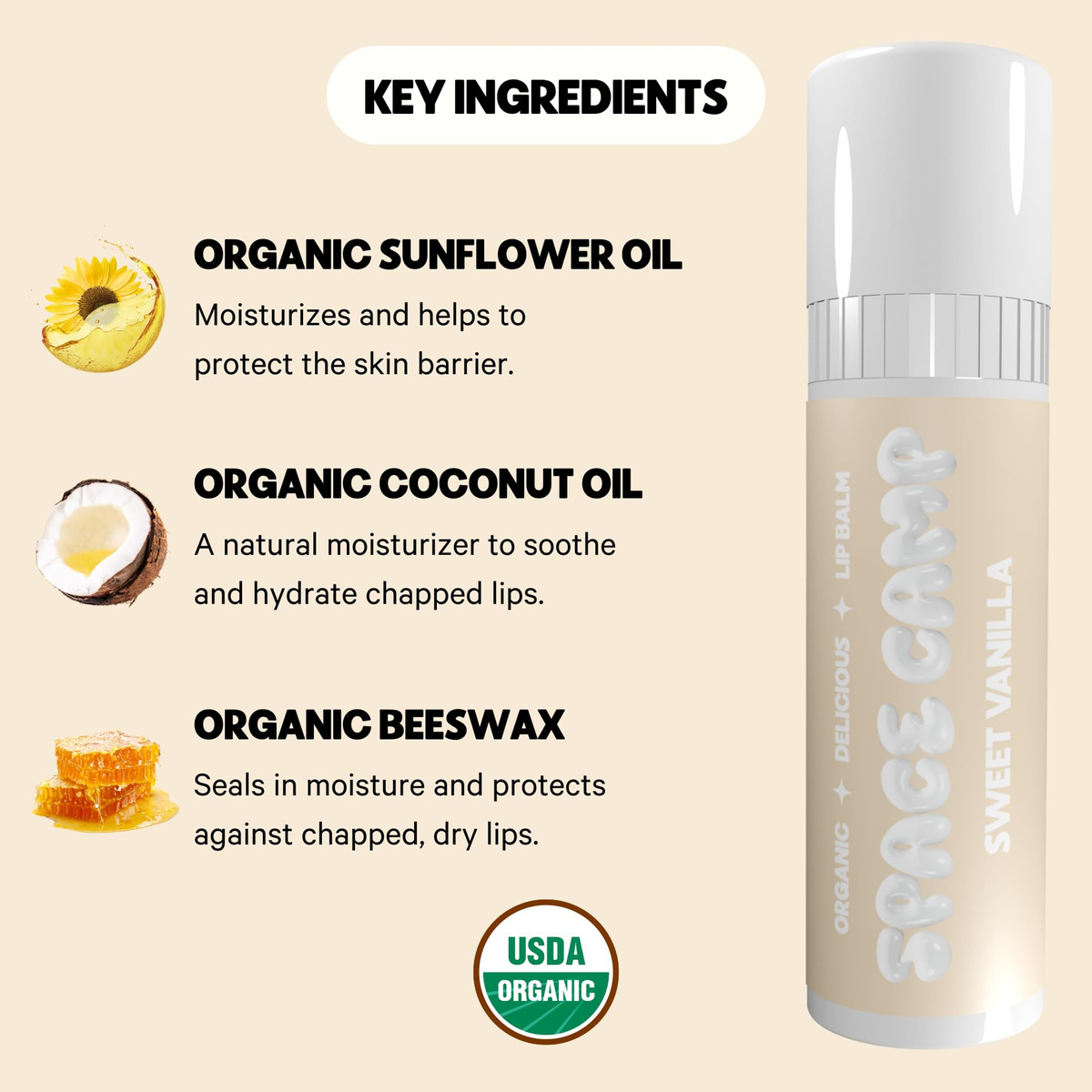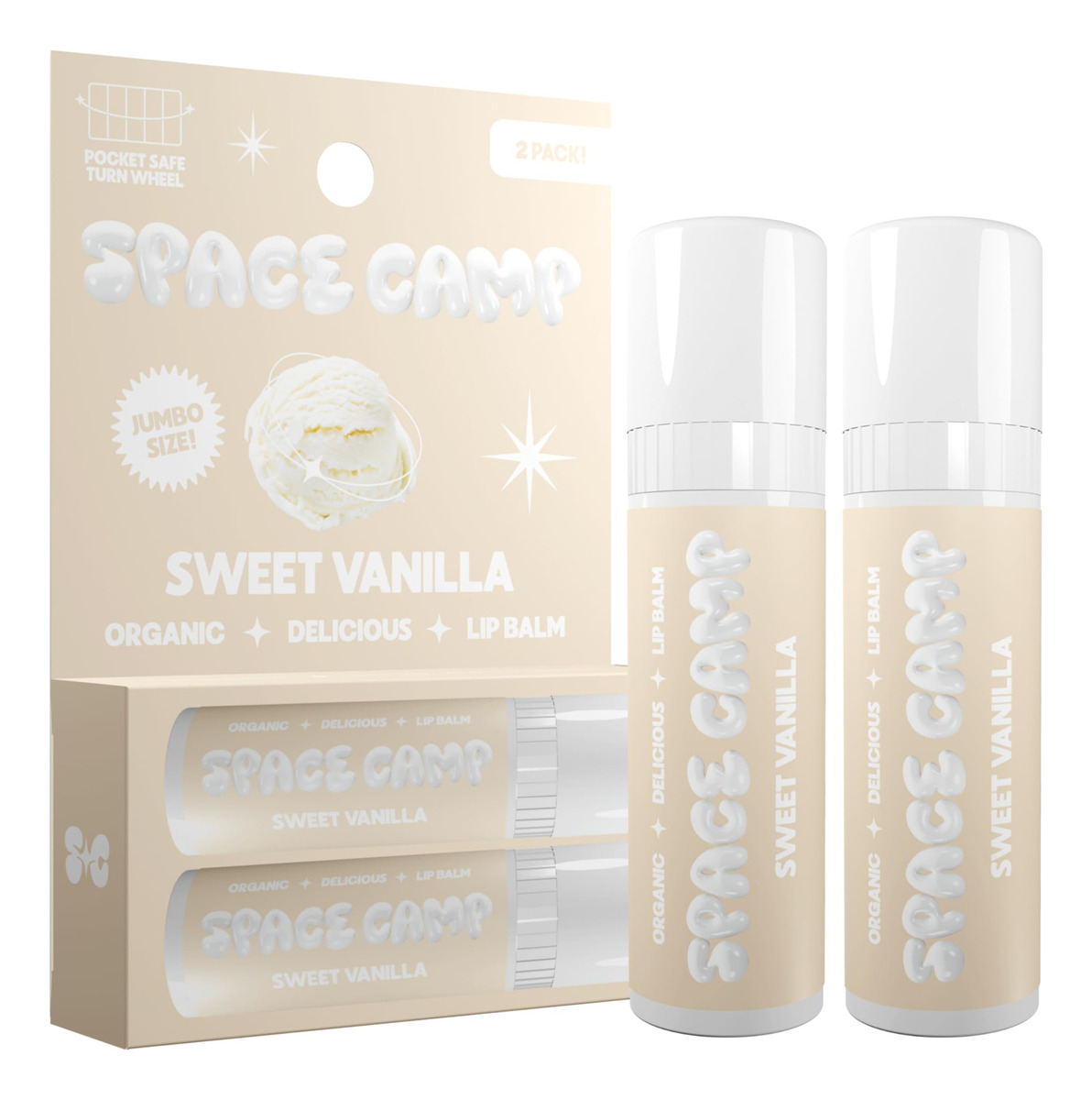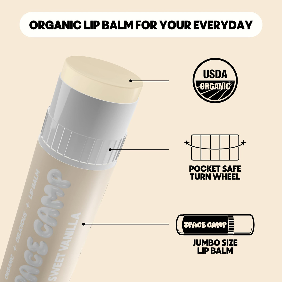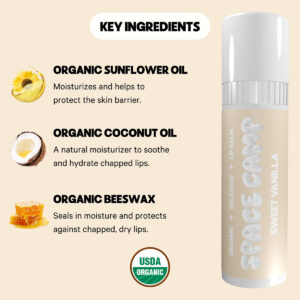 Bálsamo labial com sabor orgânico – SWEET VANILLA: suave e aveludado – desfrute da doce sensação de um clássico atemporal. – SOBRE O SPACE CAMP WELLNESS: A próxima geração de protetor labial. Somos um protetor labial orgânico, melhor para você, que vem em sabores deliciosos, um tubo gigante e fabricado aqui mesmo nos EUA. – JUMBO LIP BALM: Mais de 60% mais protetor labial do que seus tubos de protetor labial tradicionais. Com um volante seguro de bolso para preservar seu protetor labial! – INGREDIENTES LIMPOS E ORGÂNICOS: Obtenha lábios macios e hidratados com ingredientes melhores para você. Nossos protetores labiais são feitos com óleo de girassol orgânico para proteger a barreira da pele com ácidos graxos essenciais, cera de abelha orgânica para selar a umidade e proteger contra lábios rachados e óleo de coco orgânico para acalmar e hidratar. – HIDRATE SEUS LÁBIOS: Use quando seus lábios precisarem de um pouco de hidratação! Continue nutrindo os lábios rachados e mantendo-os saciados do dia à noite. – LIVRE E LIMPO: O Space Camp Wellness é livre de parabenos, ftalatos, vaselina e laurilsulfato de sódio. Também somos certificados como Leaping Bunny! Nunca testado em animais. – FEITO NOS EUA: Com nosso compromisso com a qualidade, práticas éticas de trabalho e apoio às economias locais, podemos dizer com orgulho que nossa fabricação é próxima de casa – nos EUA. Ao manter nossos ingredientes e materiais próximos, reduzimos o consumo de combustível e nossos tubos são feitos de plástico reciclado!