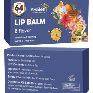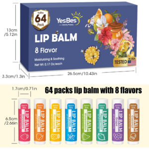 Bálsamo labial YesBes, pacote com 64 unidades, protetor labial natural a granel com vitamina E e óleo de coco, protetor labial hidratante para lábios secos e rachados, protetor labial para encher meias — 8 sabores — 8 sabores