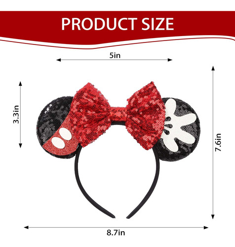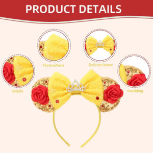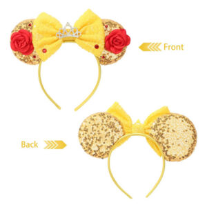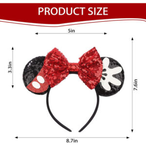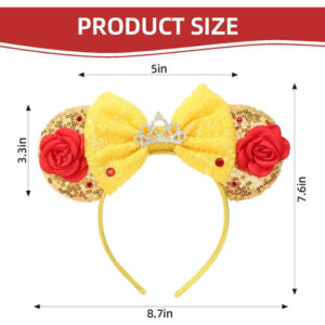 Features 1. The Mice ears headband is equipped with high quality material mouse ears. Much more beautiful than similar products. 2. The pictures were taken by myself. Because of the reflection on the sequin ears the pictures cant show the real products, the product is much more beautiful than pictures. 3. Suitable for many occasions such as Disney trip, Halloween,baby shower, Christmas, birthday party or Minnie&Mickey themed party, etc. It will attract the attention of others in any occasion. Item : Headband Style : Mouse Style ears on a comfortable headband Material : The Plastic Headband is covered with satin which is more comfortable, with 3.5 Sparkle Ears and 5 bow Package: 1 pcs of Mouse Ears Headband . These cute mouse ears headband suit for both adults and children, women and men, boys and girls. – Various Adorable Styles: Our Mouse Ears headbands come in various adorable styles for you to choose from, including: Iridescent mouse ears, Princess headbands, metallic mice ears, mermaid party decorations, rainbow mouse ears, Halloween and Christmas headband and more. Add a touch of magic to your outfit. – Fancy and Glittering Designs: The mouse ear headband features fancy and glittering designs inspired by popular elements from cartoon movies, making it a delightful accessory for any occasion. This princess belle ears headband is inspired by belles signature dress, its complete with red roses, red beads and glittering tiara. – Versatile Use: The mouse ears headband is perfect for Disney trip, presents, cosplay, girls headwear, party decorations, Christmas, Halloween, costuming, or everyday wear. Our Mini Ears headband is a versatile and fun accessory. – One Size Fits AllThe mouse ears headband is designed to fit most head sizes, its made with a flexible and comfortable material that ensures a secure and snug fit. Perfect size for adult, kids, women and girls. Its also lightweight and comfortable for all day wearing. It wont cause any headache or pain behind the ears – Satisfaction Guaranteed: We are confident in the quality of our Minnie Ears headband. If for any reason you are not satisfied, we offer a full refund or replacement. Add a touch of magic to your day with our Minnie Ears headband!