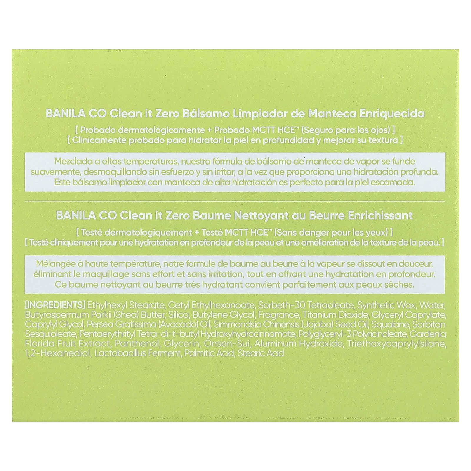 Estearato de etilhexilo, etilcaproato de cetila, cera sintética de tetraoleato de sorbato-30, água, manteiga de Butyrospermum parkii (karité), sílica, butilenoglicol, fragrância, dióxido de titânio, caprilato de glicerila, caprylyl glycol, óleo de Persea gratissima (abacate), óleo da semente de Simmondsia chinensis (jojoba), esqualano, sesquioleato de sorbitana, pentaerythrityl tetra-di-t-butyl hydroxyhydrocinnamate, polyglyceryl-3 polyricinoleate, extrato da fruta de Gardenia florida, pantenol, glicerina, onsen-sui, hidróxido de alumínio, triethoxycaprylylsilane, 1,2-hexanediol, fermento de lactobacillus, ácido palmítico, ácido esteárico.