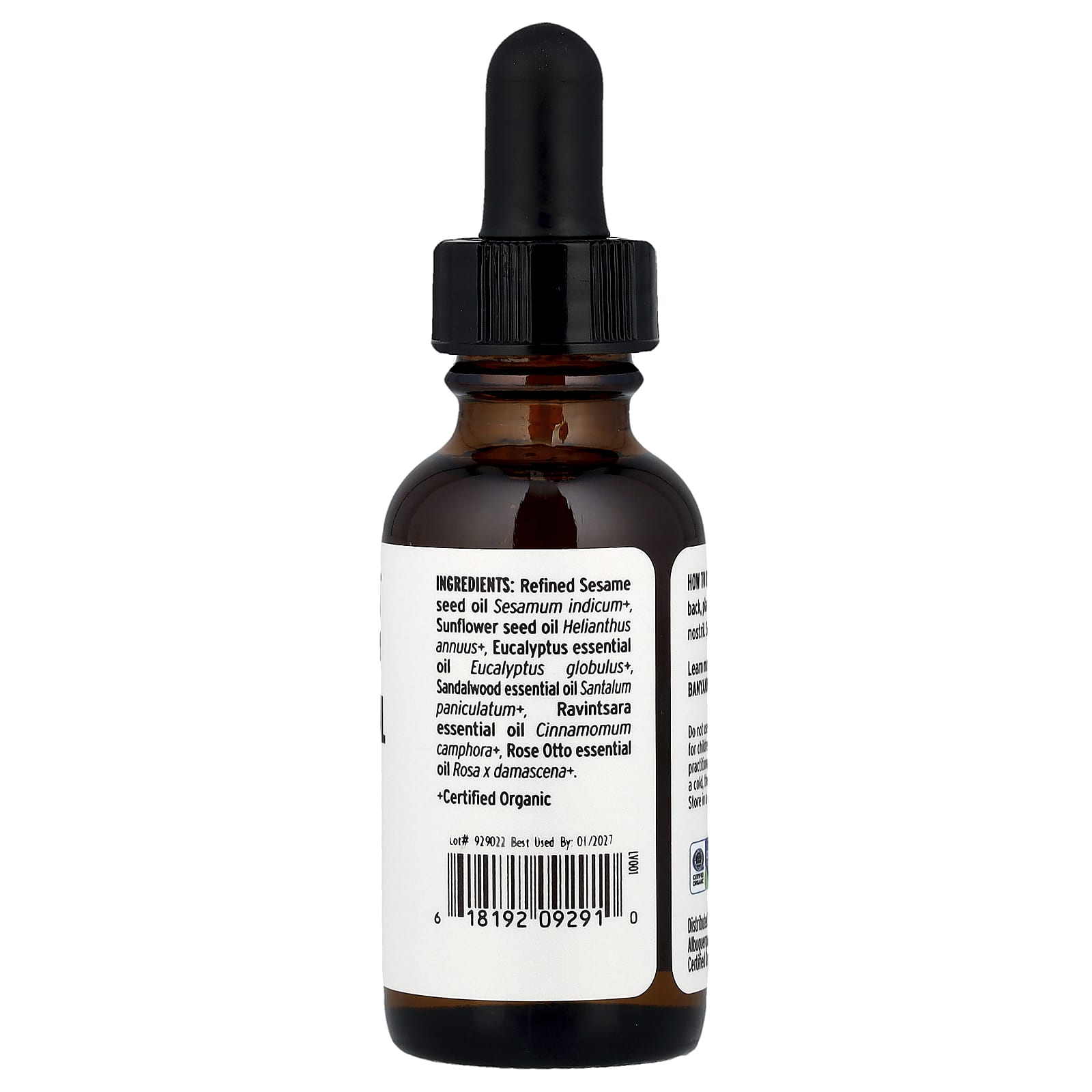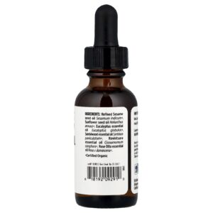 Óleo da semente de gergelim refinado, Sesamum indicum+, óleo da semente de girassol, Helianthus annuus+, óleo essencial de eucalipto, Eucalyptus globulus+, óleo essencial de sândalo Santalum paniculatum+ óleo essencial de ravintsara Cinnamomum camphora+, óleo essencial de rosa otto rosa x damascena+.
