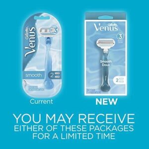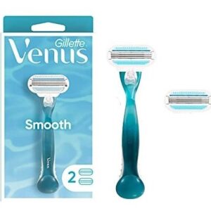 Lâmina feminina Gillette Venus Smooth – 1 alça e 2 recargas – Design durável: cada recarga de lâmina dura até um mês (com base no barbear duas vezes por semana); basta usar e substituir quando estiver pronto para uma nova – ALÇA ERGONÔMICA: projetada com um gel macio para caber confortavelmente em suas mãos – ECONOMIZE TEMPO: esta navalha tem 3 lâminas embutidas, depilando o cabelo de forma rápida e eficaz. Barbeie-se bem, nada mais — Barbear macio: feito com almofadas protetoras de elastômero confortáveis ao redor das lâminas — Apresenta uma faixa indicadora azul que desbota quando você não está mais se barbeando — Qualquer recarga de lâmina Venus serve para qualquer cabo de barbear Venus (exceto a navalha de barbear Simply Venus e Venus Pubic Hair)