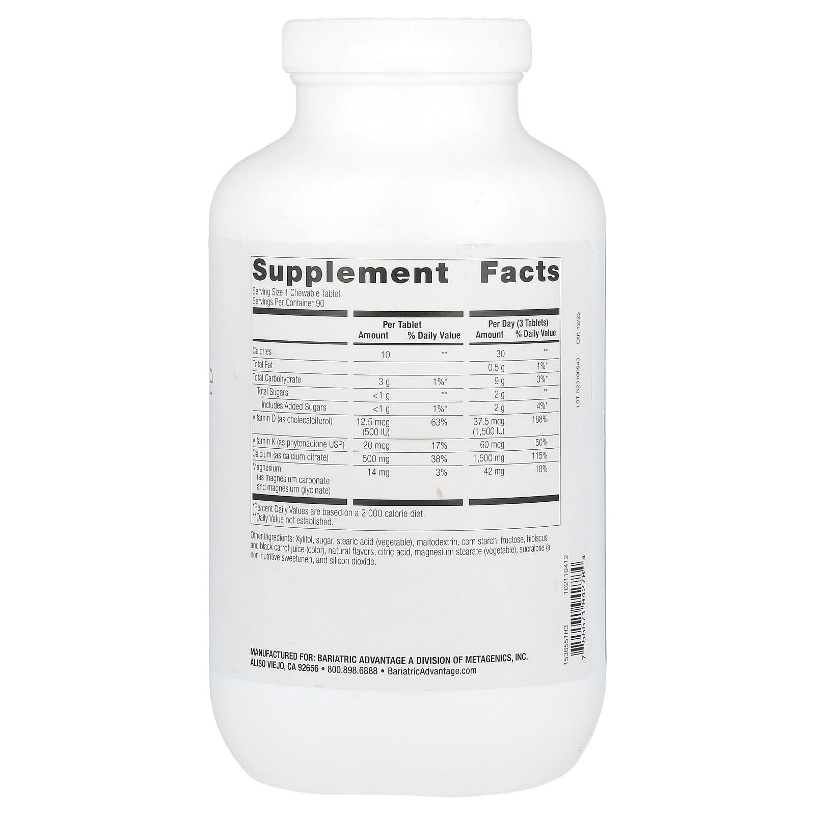 Os comprimidos Mastigáveis de Citrato de Cálcio Bariatric Advantage são especialmente formulados para pacientes bariátricos, utilizando 500 mg de cálcio apenas de citrato de cálcio e fornecendo 500 UI de vitamina D3 para auxiliar a absorção de cálcio.