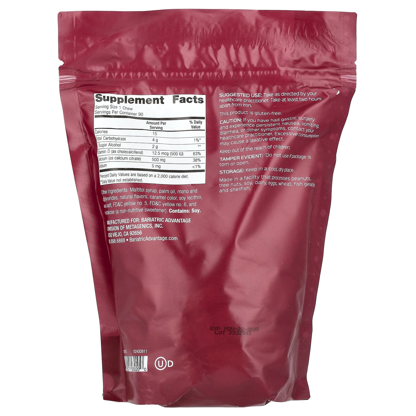 O Citrato de Cálcio Mastigável 500 mg da Bariatric Advantage é especialmente formulado para pacientes bariátricos, utilizando 500 mg de cálcio apenas de citrato de cálcio e fornecendo 500 UI de vitamina D3 para auxiliar a absorção de cálcio.