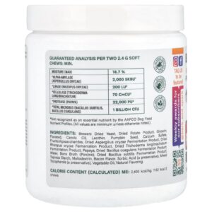 Brewers dried yeast, dried potato product, glycerin, flaxseed, canola oil, lecithin, pumpkin seed, calcium sulfate, fructooligosaccharides, dried aspergillus oryzae fermentation product, dried rhizopus oryzae fermentation product, dried trichoderma longibrachiatum fermentation product, papaya, dried bacillus coagulans fermentation product, water, bone broth (porcine), dried bacillus subtilis fermentation product, tapioca starch, maltodextrin, bacon flavor, sorbic acid (a preservative), mixed tocopherols (a preservative), vegetable oil, natural flavoring.