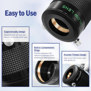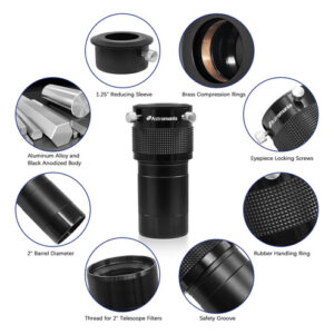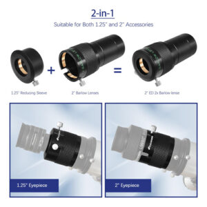 Telescópio Barlow de dupla potência Astromania 2" ED 2x Lente Barlow de alta qualidade para telescópios. A maioria dos grandes telescópios tem um focalizador de 2”. Você pode usar isso a seu favor usando uma lente Barlow de 2" e descobrindo todas as vantagens adicionais que ela pode oferecer. As vantagens: elemento de vidro ED para reduzir as aberrações de cor Lente Barlow de 2 polegadas para acessórios de 2" e 1,25" Manga redutora de 1,25" para conectar acessórios de 1,25" duplica a distância focal do telescópio. O diâmetro da lente grande oferece excelente iluminação. Ranhura de segurança para evitar que a lente caia pela rosca do filtro de 2" – Mais abertura fornece boa imagem com alto contraste; vidro ED significa que as aberrações de cores visíveis são reduzidas ao mínimo com imagens nítidas; todas as superfícies das lentes foram fornecidos com revestimento múltiplo para reduzir os reflexos – Para astrofotografia; às vezes mais focais o comprimento é necessário para ser visto em um tamanho razoável na imagem, especialmente para objetos compactos; também não há sombreamento aparente em chips de câmera de pequeno formato de imagem para grandes vantagens – Diâmetro maior tem mais espaço para lentes: 2 polegadas de diâmetro permite inserir oculares de 2 polegadas nesta barra com ampliação dupla; o diâmetro grande da lente também significa que você não notará sombras na imagem – Design ergonômico: noites claras e estreladas podem ser frias no verão significa que não há escolha a não ser se embrulhar calorosamente; foi projetado com um exterior de alta aderência para fornecer uma boa aderência significa que é fácil de manusear com segurança, mesmo com luvas. Basta desparafusar e depois parafusar em qualquer ocular de 2 polegadas; este elemento Barlow está rosqueado corretamente para essa finalidade; rosca de filtro de 2 polegadas é fornecida na parte inferior da barra e no adaptador redutor para usar filtros