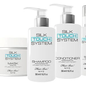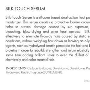 O Silk Touch Serum é um protetor térmico de dupla ação à base de silicone e um hidratante leve. Este sérum cria uma barreira protetora ao redor da cutícula do cabelo e ajuda a evitar danos causados pela exposição ao sol, tratamentos químicos, clareamento, secagem e outras fontes de calor. O Silk Touch Serum funciona de forma eficaz para eliminar os pelos soltos causados pela eletricidade estática e pelas condições climáticas, sem deixar o cabelo pesado ou deixar resíduos oleosos. Agentes condicionadores, como a queratina hidrolisada, penetram no cabelo e se ligam às proteínas quebradas da queratina para reconstruir, fortalecer e devolver a elasticidade ao cabelo, ao mesmo tempo em que adicionam brilho brilhante até mesmo aos cabelos mais opacos. Seguro para uso em cabelos tratados quimicamente e coloridos. – O SILK TOUCH SYSTEM é uma linha exclusiva de produtos de manutenção de queratina tudo-em-um. – É formulado de forma exclusiva para prolongar a vida útil de qualquer tratamento alisador de queratina. – Infundido com queratina da mais alta qualidade disponível para fortalecer e reparar ativamente as fibras capilares de dentro para fora.