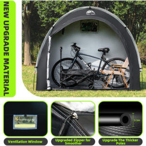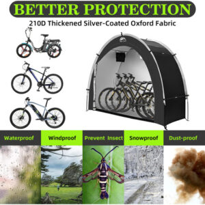 Barraca de bicicleta portátil impermeável ao ar livre. – Grande espaço de armazenamento: nossas barracas de armazenamento de bicicletas oferecem muito espaço, medindo 83 polegadas x 31,5 polegadas x 67 polegadas quando totalmente desdobradas, para armazenar facilmente as bicicletas, motocicletas e outros itens da família. Como garagens e abrigos portáteis, é a escolha perfeita para famílias ou entusiastas do ciclismo que possuem várias bicicletas. – Novos materiais de atualização: a barraca de armazenamento externo à prova d'água usa 210 Tecido Oxford banhado a prata, resistente a rasgos, com revestimento de proteção ultravioleta impermeável PU 4000, protetor solar, isolamento térmico e ultravioleta proteção, use adesivos à prova d'água, para que não haja necessidade de se preocupar com vazamentos e desbotamento de galpões de bicicletas e motocicletas. E todas as partes costuradas da barraca da garagem são tratadas com fita impermeável e fornecem proteção abrangente contra água, poeira e insetos. – Estrutura sólida: a estrutura portátil do galpão e os postes de fibra de vidro de 9 mm de espessura tornam a barraca mais estável e a barraca de armazenamento de bicicletas pode ser melhor protegida para garantir resistência ao vento e estabilidade. A barraca de bicicleta externa permanece estável mesmo em condições de vento severo. As etapas de instalação também são muito simples e pode ser montada rapidamente em menos de dez minutos. – Preferência leve para uso externo: o tamanho desta barraca de armazenamento portátil após o armazenamento é: 17,8* 6* 6 polegadas, pesando apenas 8,7 libras, dobrada como uma tenda externa leve e compacta. A própria bolsa de armazenamento pode ajudá-lo a guardar sua barraca rapidamente, perfeita para andar de bicicleta, viajar de moto, caminhar ou andar de mochilão. Esta é uma boa opção para ciclismo ao ar livre em grupo, e também é uma ótimo presente para entusiastas do ciclismo. – Ampla aplicação: nosso galpão de armazenamento externo também é muito versátil, ele pode ser usado não apenas para armazenar bicicletas e motocicletas, mas também como uma barraca portátil de armazenamento externo para guardar a bagunça do seu quintal, como cortadores de grama, ferramentas de jardim, brinquedos infantis ao ar livre, equipamentos de piscina e outros itens. Resolva facilmente seus problemas de armazenamento e mantenha seu quintal organizado e limpo.