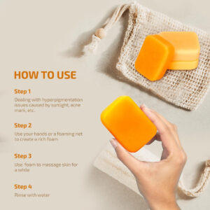 • Áreas de manchas escuras rejuvenescedoras, esfoliantes e nutritivas: primeiro, umedeça a pele com água morna e aplique o sabonete de açafrão uniformemente na pele. Em seguida, massageie por 20 a 30 segundos e, finalmente, enxágue com água. Use 1 ou 2 vezes ao dia durante os melhores resultados ao longo do sabonete que penetra e revitaliza a pele