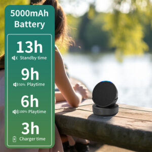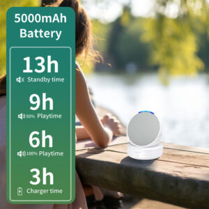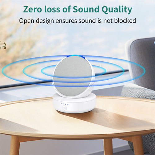 O design aberto garante que não haja bloqueio ou interferência na qualidade do som, além de impedir que o alto-falante doméstico inteligente arranhe e deslize. 4. O tempo de espera é de 13 horas, o tempo de reprodução em 100% do volume é de cerca de 6 horas e o tempo de reprodução em 50% do volume é de cerca de 9 horas.