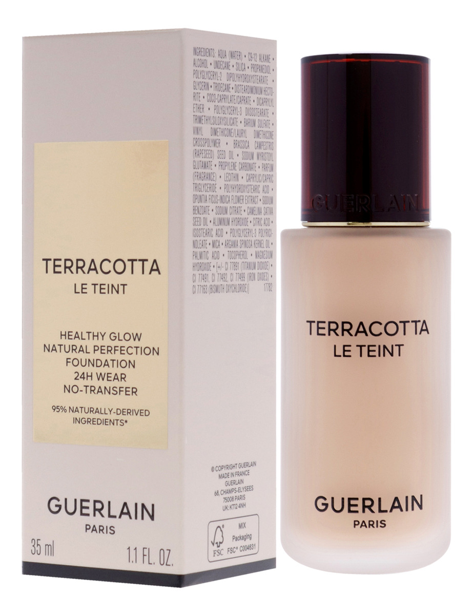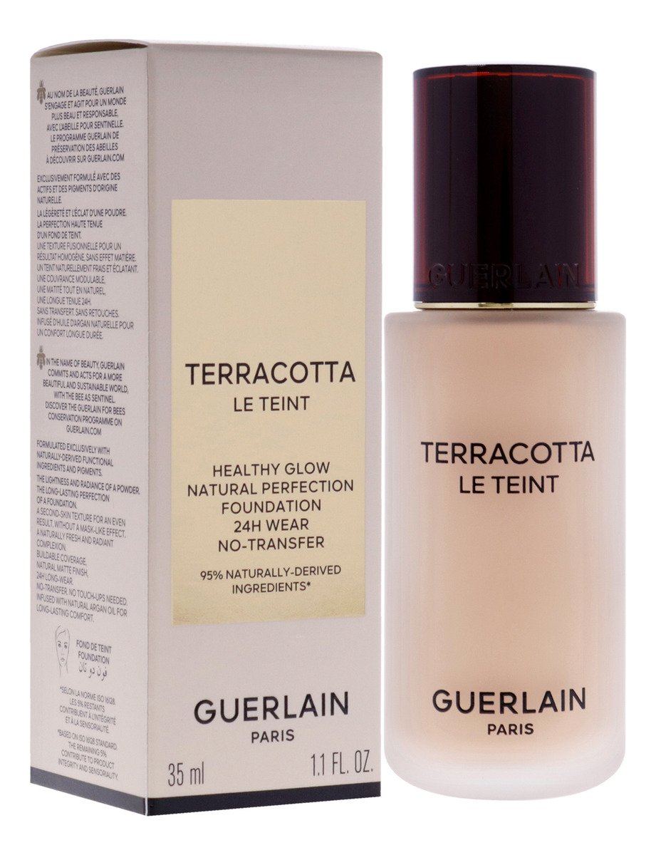 Essa base de textura incrivelmente fina e ultraleve oferece uma sensação quase inexistente. Sua fórmula arejada se funde com a pele e é incrivelmente leve, oferecendo uma cobertura perfeita, ultra-montável, de média a total. A Guerlain está definindo os contornos de uma nova geração de pele com Terracotta Le Teint: uma base líquida, formulada com 95 por cento de ingredientes de origem natural.