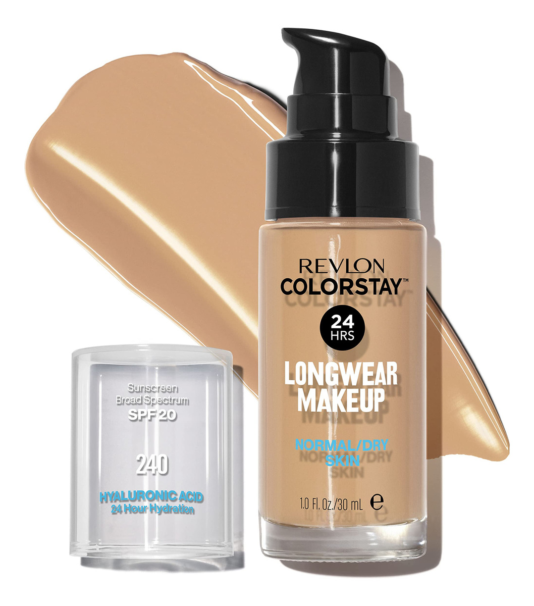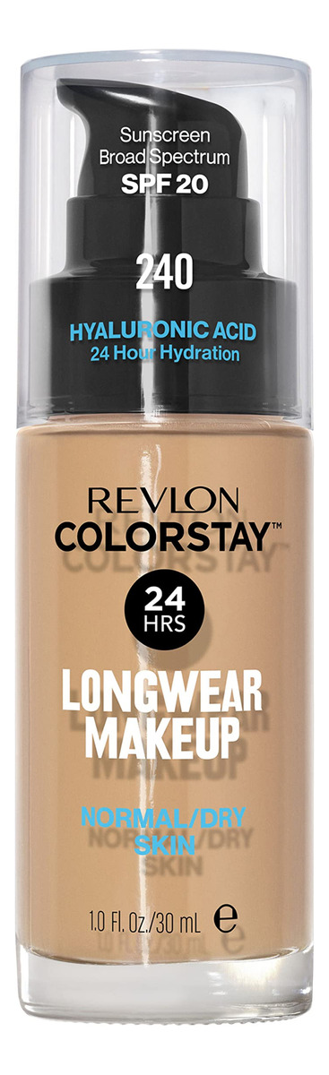 Base líquida Revlon, maquiagem facial ColorStay para pele normal e seca, SPF 20, cobertura média completa de longa duração com acabamento fosco, sem óleo, 240 bege médio, 1,0 onça – LONGA DURAÇÃO: base sem óleo e sem fragrância com SPF 20 de amplo espectro cria uma aparência perfeita por até 24 horas; sensação confortável e leve – Cuidados com a pele: o ácido hialurônico aumenta a umidade da pele em mais de 120% – ACABAMENTO MACIO E NATURAL: 24 horas de hidratação para um brilho saudável — À prova de movimentos: resistente à transferência, à prova d'água e fácil de usar; resiste ao calor, ao suor e à umidade — PARA TODAS AS PELES: 24 tons diversos