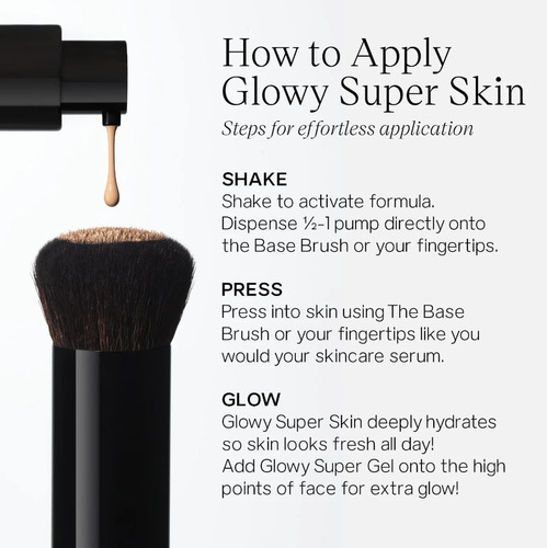 Glowy Super Skin Tint Liquid Foundation é uma base de sérum leve com cobertura de estrutura média que ilumina a pele para um acabamento úmido e luminoso. Pressione na pele como um sérum para cuidados com a pele para uma pele hidratada e brilhante. Composta por 85% de ingredientes para a pele e 15% de pigmento leve, pense na Glowy Super Skin Tint Liquid Foundation como seu sérum hidratante para a pele com cobertura de construção média. A separação é natural, então sempre agite o frasco primeiro para ativar os cuidados com a pele e os pigmentos. Para usar, comece com 1 bomba para uma cobertura perfeita e semelhante à pele que dura o dia todo. Aplique pressionando na pele com as pontas dos dedos e continue pressionando com um pincel denso como o The Base Brush. Isso libera os ingredientes e garante que a pele não apenas tenha uma aparência perfeita, mas também absorva a beleza da mistura de cuidados com a pele. Para obter mais cobertura, deixe a primeira camada ser definida e depois construa. O Glowy Super Skin Tint é vegano, testado por dermatologistas, seguro para peles sensíveis e sem fragrância. – 85% de sérum para a pele, 15% de pigmento leve para 100% de sua melhor pele de todos os tempos. A Glowy Super Skin Tint Foundation oferece benefícios para a pele, cobertura média e um acabamento luminoso de segunda pele. Use esta fórmula leve de sérum como faria com seu sérum para a pele para obter todos os benefícios. O Shade 20 é médio a médio/bronzeado com tons frios. – Nossa fórmula de base leve para tonalidade de pele contém ingredientes sobrecarregados com benefícios de melhorar a pele e pigmento leve que se mistura com a barreira externa da pele para aquela aparência recém-aplicada o dia todo. O resultado é uma cobertura hidratada e leve que fará você esquecer que está usando base. – O esqualano derivado de açúcar é leve e de rápida absorção para manter a hidratação. O extrato de groselha indiana é rico em antioxidantes que ajudam a clarear a pele, enquanto o ácido hialurônico atrai e retém a umidade para suavizar e hidratar a pele. Os peptídeos de farelo de arroz reduzem a aparência de linhas finas e poros, ajudando a atenuar as manchas escuras e a clarear o tom da pele. A glicerina é um ácido graxo conhecido por aumentar o nível de umidade natural da pele. – COMECE com uma tela nova de pele limpa e preparada. AGITE para ativar a [Glowy Super Skin Tint Foundation]. A separação é normal devido a 85% dos ingredientes para a pele. AQUEÇA 1 bomba na ponta dos dedos ou BOMBEIE diretamente na escova base. PRESSIONE na pele como se fosse um sérum hidratante até ficar totalmente misturado. DEFINA onde necessário com o Airset usando The Fluffy Brush. APROVEITE aquele Signature SaieGlow. – Glowy Super Skin é vegano, testado por dermatologistas, seguro para peles sensíveis e sem fragrância.