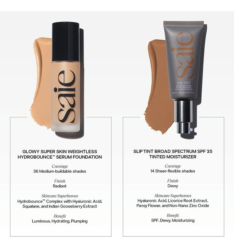 Glowy Super Skin Tint Liquid Foundation é uma base de sérum leve com cobertura de estrutura média que ilumina a pele para um acabamento úmido e luminoso. Pressione na pele como um sérum para cuidados com a pele para uma pele hidratada e brilhante. Composta por 85% de ingredientes para a pele e 15% de pigmento leve, pense na Glowy Super Skin Tint Liquid Foundation como seu sérum hidratante para a pele com cobertura de construção média. A separação é natural, então sempre agite o frasco primeiro para ativar os cuidados com a pele e os pigmentos. Para usar, comece com 1 bomba para uma cobertura perfeita e semelhante à pele que dura o dia todo. Aplique pressionando na pele com as pontas dos dedos e continue pressionando com um pincel denso como o The Base Brush. Isso libera os ingredientes e garante que a pele não apenas tenha uma aparência perfeita, mas também absorva a beleza da mistura de cuidados com a pele. Para obter mais cobertura, deixe a primeira camada ser definida e depois construa. O Glowy Super Skin Tint é vegano, testado por dermatologistas, seguro para peles sensíveis e sem fragrância. – 85% de sérum para a pele, 15% de pigmento leve para 100% de sua melhor pele de todos os tempos. A Glowy Super Skin Tint Foundation oferece benefícios para a pele, cobertura média e um acabamento luminoso de segunda pele. Use esta fórmula leve de sérum como faria com seu sérum para a pele para obter todos os benefícios. O Shade 10 é leve a médio com tons neutros. – Nossa fórmula de base leve para tonalidade de pele contém ingredientes sobrecarregados com benefícios de melhorar a pele e pigmento leve que se mistura com a barreira externa da pele para aquela aparência recém-aplicada o dia todo. O resultado é uma cobertura hidratada e leve que fará você esquecer que está usando base. – O esqualano derivado de açúcar é leve e de rápida absorção para manter a hidratação. O extrato de groselha indiana é rico em antioxidantes que ajudam a clarear a pele, enquanto o ácido hialurônico atrai e retém a umidade para suavizar e hidratar a pele. Os peptídeos de farelo de arroz reduzem a aparência de linhas finas e poros, ajudando a atenuar as manchas escuras e a clarear o tom da pele. A glicerina é um ácido graxo conhecido por aumentar o nível de umidade natural da pele. – COMECE com uma tela nova de pele limpa e preparada. AGITE para ativar a [Glowy Super Skin Tint Foundation]. A separação é normal devido a 85% dos ingredientes para a pele. AQUEÇA 1 bomba na ponta dos dedos ou BOMBEIE diretamente na escova base. PRESSIONE na pele como se fosse um sérum hidratante até ficar totalmente misturado. DEFINA onde necessário com o Airset usando The Fluffy Brush. APROVEITE aquele Signature SaieGlow. – Glowy Super Skin é vegano, testado por dermatologistas, seguro para peles sensíveis e sem fragrância.