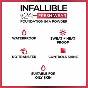Demand more from longwear! Infallible up to 24hr fresh wear foundation-in-a-powder covers like a liquid a mattifies with no cakey look. The weightless powder texture gives full coverage and a natural, matte finish that looks fresh hour after hour. The formula feels breathable and weightless leaving skin feeling comfortable for up to 24hrs. With a blurring effect and all day matte finish, this powder evens skin tone with no transfer. It is waterproof, heatproof and sweatproof. Available in 16 shades and suitable for all skin types, even oily skin and acne prone skin. It is non-comedogic with no greasy feel and has been tested under dermatological control.