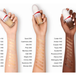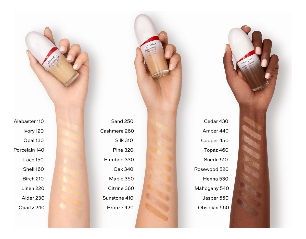 Shiseido RevitalEssence Skin Glow Foundation SPF 30-560 – SPF GLOW FOUNDATION – Essa base SPF semelhante a um sérum desliza suavemente sobre a pele e se transforma em um acabamento de maquiagem brilhante que dura 12 horas. Uniformiza instantaneamente a pele, desfoca os poros e hidrata por 24 horas com proteção SPF 30 de amplo espectro. – PRINCIPAIS BENEFÍCIOS – Oferece cobertura média e edificável que é resistente à transferência, resistente a vincos e ao desbotamento. Em apenas 1 semana, a pele nua fica mais lisa com linhas finas visivelmente reduzidas. Faz com que a pele pareça mais uniforme para um acabamento saudável e brilhante. – TECNOLOGIA AVANÇADA DE CUIDADOS COM A PELE – Alimentado por Kefir+ fermentado e niacinamida, dois prebióticos que estimulam a capacidade de manter um microbioma saudável. Esta fórmula é livre de parabenos, sem óleo mineral e sem fragrância. – COMO USAR – Agite bem antes de usar. Espalhe uniformemente do centro do rosto para fora. Para aumentar a cobertura, use com o pincel DAIYA FUDE Face Duo. – ESPECIALISTAS JAPONESES EM BELEZA – As texturas modernas se unem à ciência de ponta na coleção de bases, corretivos, pós e primers da Shiseido, proporcionando uma tez saudável e perfeita em todos os sentidos.