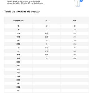 EUR31=19,5mx=31chile=29Brasil EUR32=20mx=32chile=30Brasil EUR33=21mx=33chile=31Brasil EUR34=21,5mx=34=3mx=34=3mx=34e=32 Brasil EUR35=22mx=35Chile=33 Brasil EUR36=23mx=36Chile=34Brasil EUR37=23,5MX=37Chile=35Brasil EUR38EUR = 24,5 MX=38 Chile = 36 Brasil EUR 39 = 25 MX= 38,5 Chile = 37 Brasil EUR 40 = 25,5 MX= 39 Chile = 38 Brasil