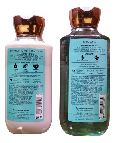 Infundido com as coisas boas (vitamina E, manteiga de karité e óleo de coco) A textura leve absorve rapidamente Feito sem parabenos ou corantes artificiais Dermatologista testado Como cheira: o dia da praia perfeito (areia, sol, ondas e tudo). Notas de fragrância: Frangipani floresce, coco torrado e águas de bergamota. • Como cheira: o dia da praia perfeito (areia, sol, ondas e tudo). Notas de fragrância: Frangipani floresce, coco torrado e águas de bergamota. • Infundido com as coisas boas (vitamina E, manteiga de karité e óleo de coco) • A textura leve absorve rapidamente. Feito sem parabenos ou corantes artificiais • A arte da garrafa pode variar Color: Marca: Bath & Body Works Dimensiones: 0.038 x 0.178 x 0.152 mts Peso del Producto: 0.617 Kilogramos. Peso de Envio: 0.617 Kilogramos. Modelo: B0DDJ4KRB2 Garantia do vendedor: 30 dias