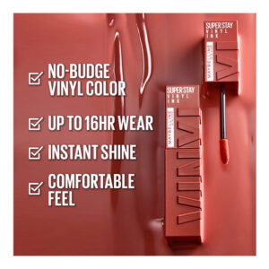 Tinta de vinil Maybelline Super Stay, maquiagem de batom líquido de longa duração, cor altamente pigmentada e brilho instantâneo, batom marrom destemido, 0,14 fl oz, 1 unidade — Batom líquido com tinta de vinil Maybelline Superstay brilhante: esse batom marrom líquido de longa duração oferece uma cor de vinil sem borrões e até 16 horas de uso, com nossa fórmula Color Lock que desafia manchas e transfere; basta sacudir e nadar Fórmula vegana: passe essa cor confortável em seus lábios para obter um brilho instantâneo em uma fórmula vegana sem ingredientes de origem animal. Agora disponível em 20 tons saturados, do vermelho forte ao nude. Use até 16 horas sem sair. – Para aplicar, basta sacudir e passar o produto nos lábios; agite por pelo menos cinco segundos antes de aplicar; aplique normalmente nos lábios limpos e secos usando seu aplicador preciso de ponta flocada e deixe secar completamente – Crie qualquer look com a Maybelline: base, cremes BB, corretivos e pós fixadores para a tela, sombras, rímel e sobrancelha perfeitos lápis e delineadores para qualquer aparência de olhos e produtos labiais, desde um batom fosco impressionante até um brilho labial rechonchudo — Remova a maquiagem Maybelline com água micelar: use Garnier Água micelar como removedor de maquiagem suave à noite e como limpador facial pela manhã para preparar a pele para a maquiagem Maybelline
