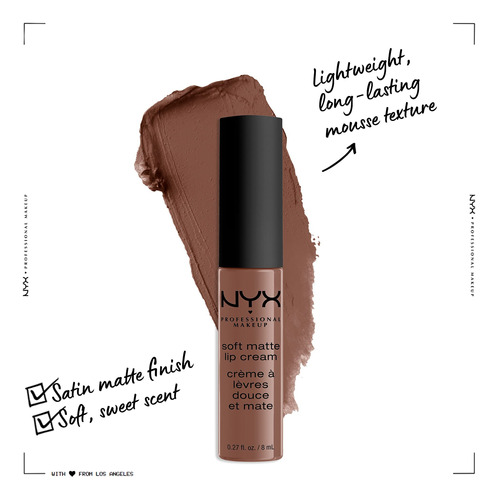 NYX PROFESSIONAL MAKEUP Soft Matte Lip Cream, Lightweight Liquid Lipstick – Berlin (Medium Warm Brown) – Soft Matte Lip Cream: Creamy soft matte coverage that never feels dry, in matte nudes and red lipstick shades inspired by world cities; Slide on a Soft Matte Lip Cream and instantly transport yourself – Lip Stain Color: Swipe this plush, creamy lightweight matte lipstick on the center of your lips and blend out with your finger or brush for a lip tint look that sets to a smooth matte finish – Lip Products for the Perfect Pout: Doll your lips in creamy, long lasting perfection; Try our complete line of lip makeup including liquid lipstick, lip gloss, lip cream, lip liner and butter gloss – Cruelty Free Cosmetics: We believe animals belong in our arms, not in a lab; All of our makeup is certified and acknowledged by PETA as a cruelty free brand; We dont test any of our products on animals – Discover NYX Professional Makeup: Try all of our professional makeup products today from eyeshadow, eyeliner, and false lashes to liquid lipstick, lip gloss, primer, concealer, setting sprays and eyebrow makeup