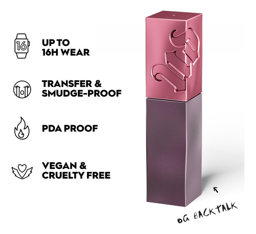 VICE LIP BOND — OG BACKTALK — BATOM LÍQUIDO DE ALTO BRILHO — Esse batom líquido de longa duração e altamente pigmentado pode ser usado confortavelmente por até 16 horas com um acabamento de brilho instantâneo, sem parecer pegajoso ou pegajoso! Os lábios ficarão hidratados com uma cobertura completa e uniforme. – Cor de um toque – Lip Bond dá uma cor ao toque com conforto que compromete. Cada tonalidade oferece brilho instantâneo, sem descamação ou rachaduras. Vegano e livre de crueldade, este batom à prova de manchas, à prova de transferência e resistente à água pode resistir a qualquer vício! – BATOM BRILHANTE QUE PERMANECE — Se você está procurando um tom vermelho intenso (como Unbreakable), um tom nude (Text 'Em) ou um lábio roxo ousado (sem restrições), o novo Vice Lip Bond é o melhor batom suave e sem bagunça para saturação intensa de cores – COMO APLICAR – Ative a cor brilhante do batom com um shake de 5 segundos. Aplique e deixe secar quanto mais tempo endurecer, melhor ficará!