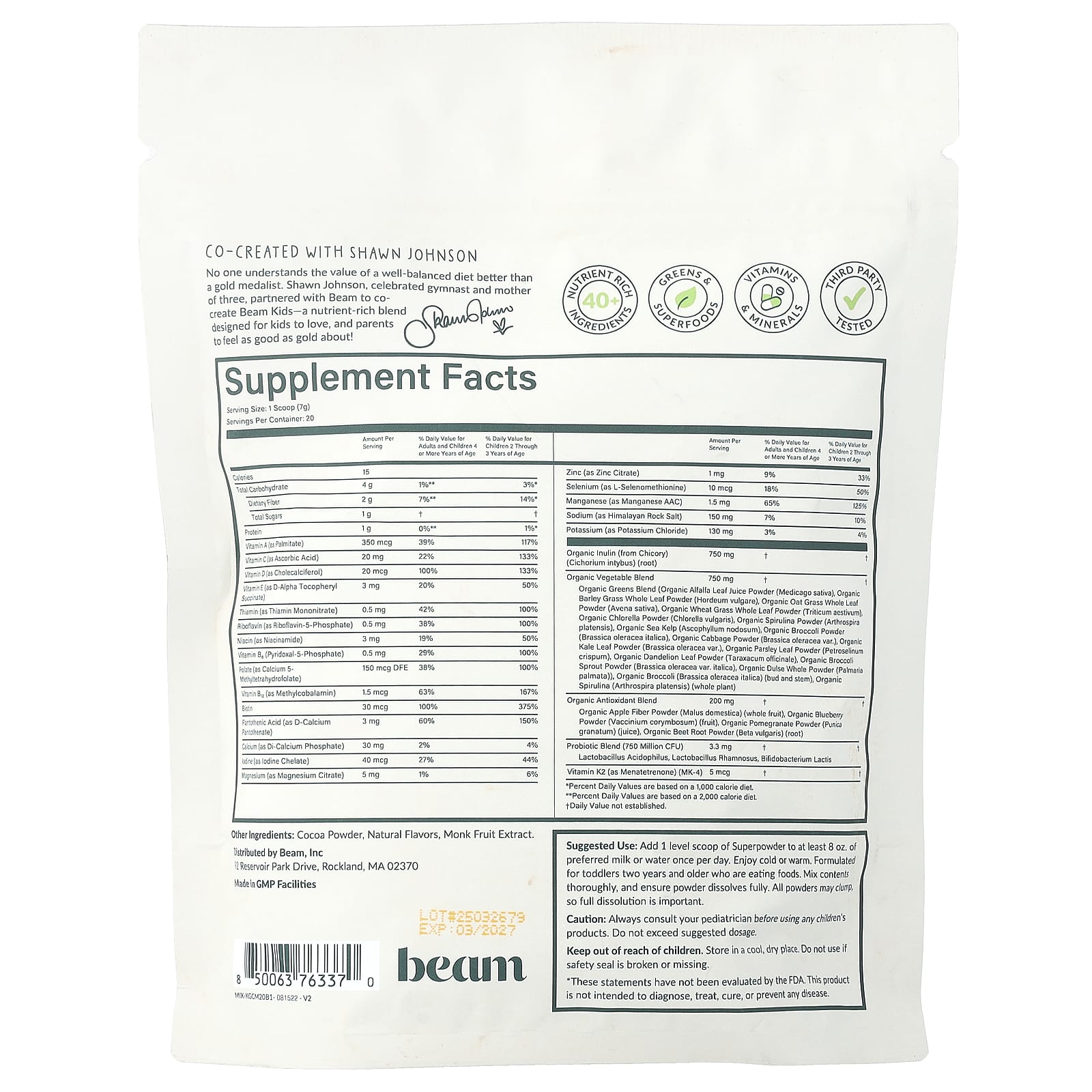 Beam Superpó em Pó para Crianças Chocolate 140 g (493 oz) – Beam Bebês e Crianças Saúde Infantil Vitaminas para Crianças Multivitamínicos Infantis Verduras e superalimentos para crianças.