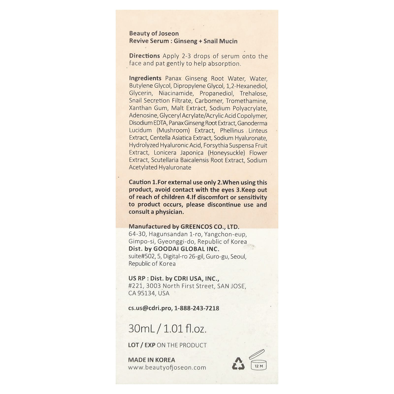 Beauty of Joseon Sérum Revive Ginseng + Mucina de Caracol 30 ml (101 fl oz) – Beauty of Joseon Beleza Tratamentos e Séruns Séruns Faciais Tratamentos e Séruns K-Beauty.