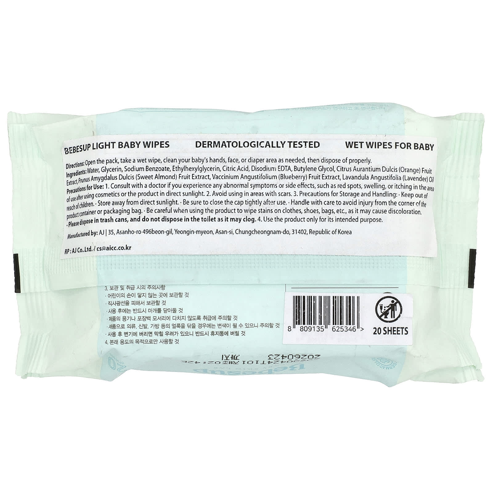 Bebesup Lenços Umedecidos para Bebês Light 20 Folhas – Bebesup Bebês e Crianças Fraldas Lenços Umedecidos para Bebês Beleza Limpeza Facial Lenços faciais K-Beauty.