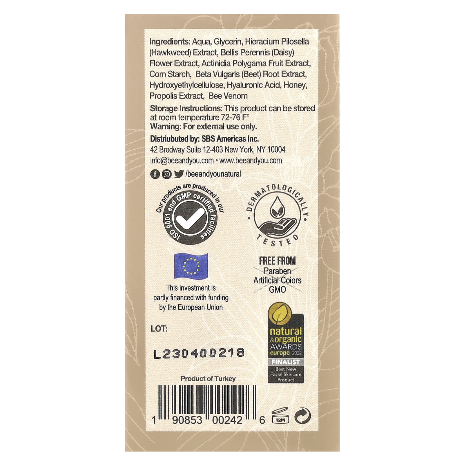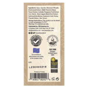 Aqua, glicerina, extrato de Hieracium pilosella (agulha), extrato da flor de Bellis perennis (margarida), extrato da fruta de Actinidia polygama, amido de milho, extrato de raiz de Beta vulgaris (beterraba), hietelose, ácido hialurônico, mel, extrato de própolis, veneno de abelha.