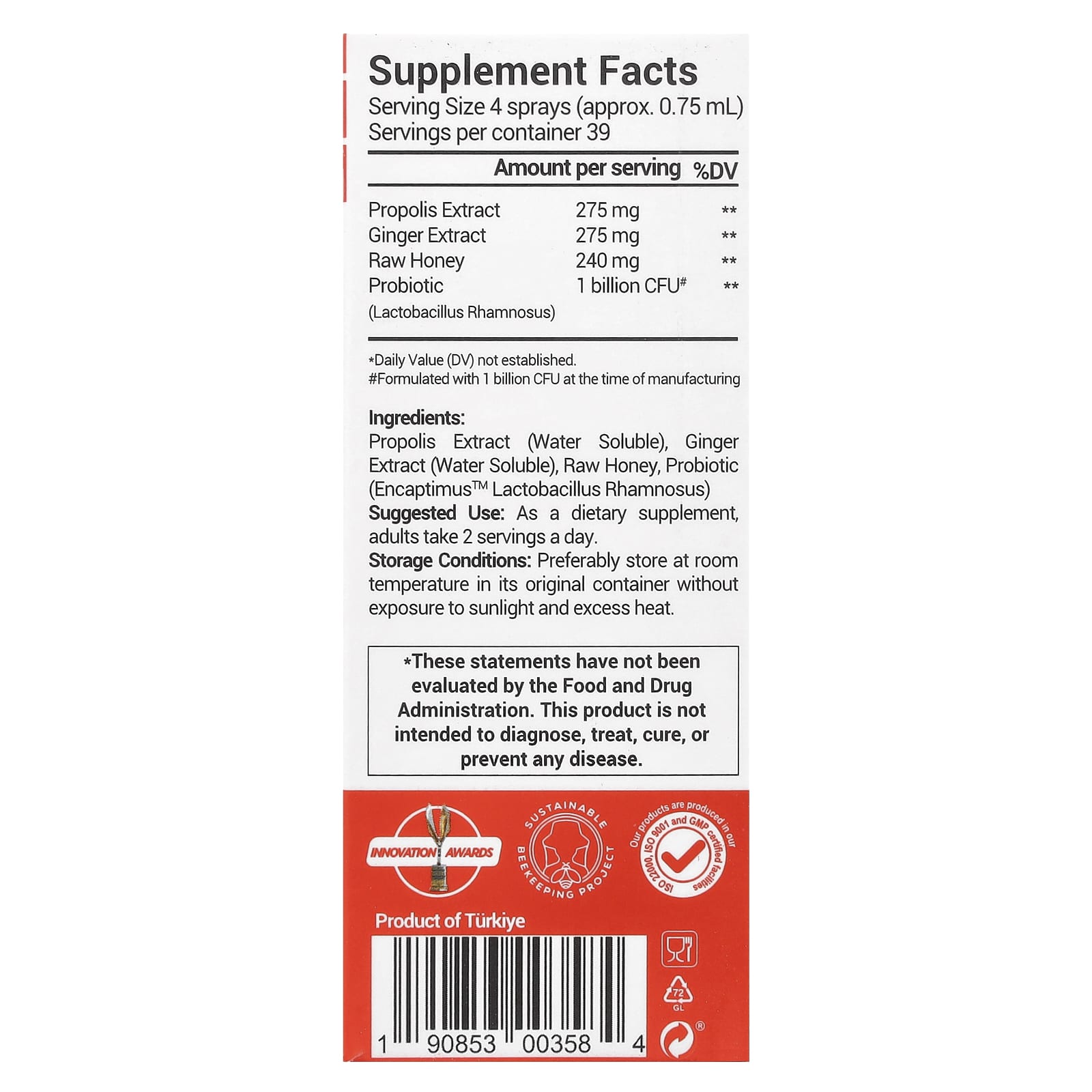 Extrato de própolis (solúvel em água), extrato de gengibre (solúvel em água), mel puro, probiótico (Lactobacillus Rhamnosus Encaptimus™).