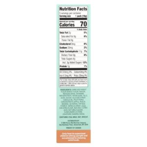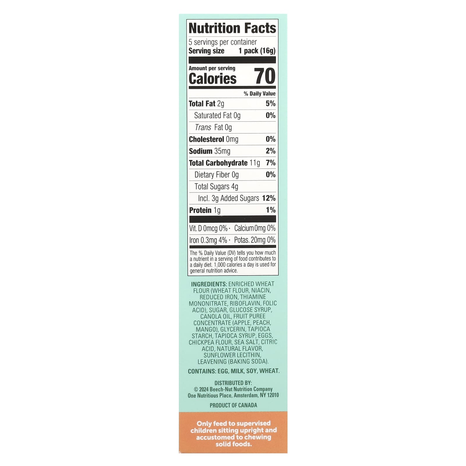 Farinha de trigo enriquecida (farinha de trigo, ácido nicotínico, ferro reduzido, mononitrato de tiamina, riboflavina, ácido fólico), açúcar, xarope de glicose, óleo de canola, concentrado de purê de frutas (maçã, pêssego, manga), glicerina, amido de tapioca, xarope de tapioca, ovos, farinha de grão-de-bico, sal marinho, ácido cítrico, sabor natural, lecitina de girassol, fermentação (bicarbonato de sódio).