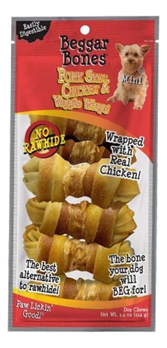 Beggar Bones são uma ótima alternativa aos ossos de couro cru. Beggar Bones são mais de 99% digeríveis e totalmente seguros para todos os cães. Usamos frango e pele de porco criados em fazendas em nossos ossos para que seu cão adore o sabor delicioso! Beggar Bones satisfaz as necessidades mastigatórias de seus cães e também ajuda a manter seus dentes e gengivas saudáveis. Nossos estudos independentes mostram que os cães preferem 10 a 1 ossos de mendigo aos ossos da concorrência. Ideal para mastigadores leves a moderados. Totalmente seguro. Necessidades de mastigação satisfeitas. Alto teor de proteína