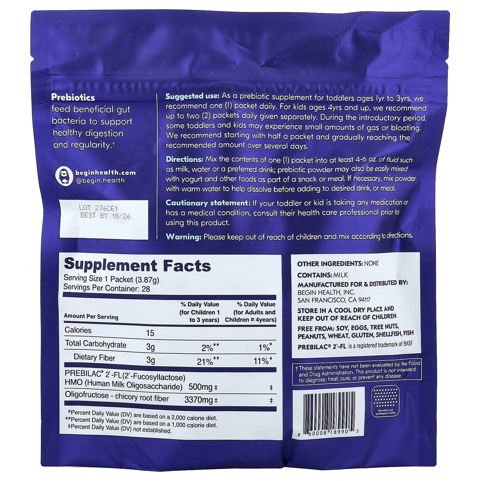 Misture o conteúdo de uma (1) embalagem em pelo menos 4 a 6 oz de um líquido, como leite, água ou uma bebida de sua preferência; O prebiótico em pó também pode ser facilmente misturado com iogurte e outros alimentos como parte de um lanche ou refeição. Se necessário, misture o pó com água morna para ajudar a dissolver antes de adicionar à bebida ou refeição desejada.