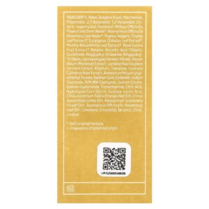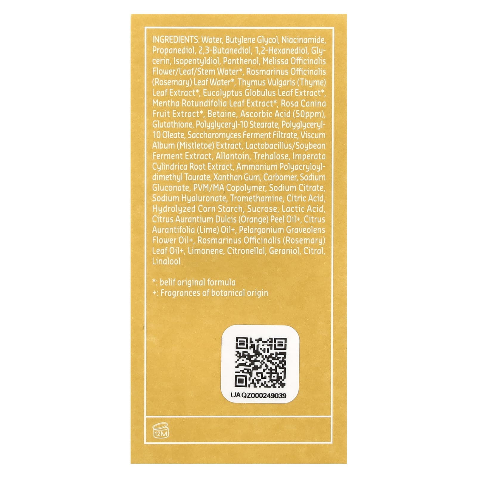 Água, butilenoglicol, nicotinamida, propanodiol, 2,3-butanediol, 1,2-hexanediol, glicerina, ispentildiol, pantenol, água da flor/folha/caule de Melissa officinalis*, água da folha de Rosmarinus officinalis (alecrim)*, extrato da folha de Thymus vulgaris (tomilho)*, extrato da folha de Eucalyptus globulus* extrato da folha de Mentha rotundifolia*, extrato da fruta de Rosa canina*, betaína, ácido ascórbico (50 ppm), glutationa, estearato de poliglicerila-10, oleato de poliglicerila-10, filtrado de fermento de saccharomyces, extrato de Viscum album (visco), extrato de fermentação de soja/lactobacillus, alantoína, trealose, extrato da raiz de Imperata cylindrica, polyacryloyldimethyl taurate de amônio, goma xantana, carbômer, gliconato de sódio, copolímero pvm/ma, citrato de sódio, hialuronato de sódio, trometamol, ácido cítrico, amido de milho hidrolisado, sacarose, ácido láctico, óleo da casca de Citrus aurantium dulcis (laranja)+, óleo de Citrus aurantifolia (limão-taiti)+, óleo da flor de Pelargonium graveolens+, óleo da folha de Rosmarinus officinalis (alecrim)+, limoneno, citronelol, o geraniol, citral, linalol.