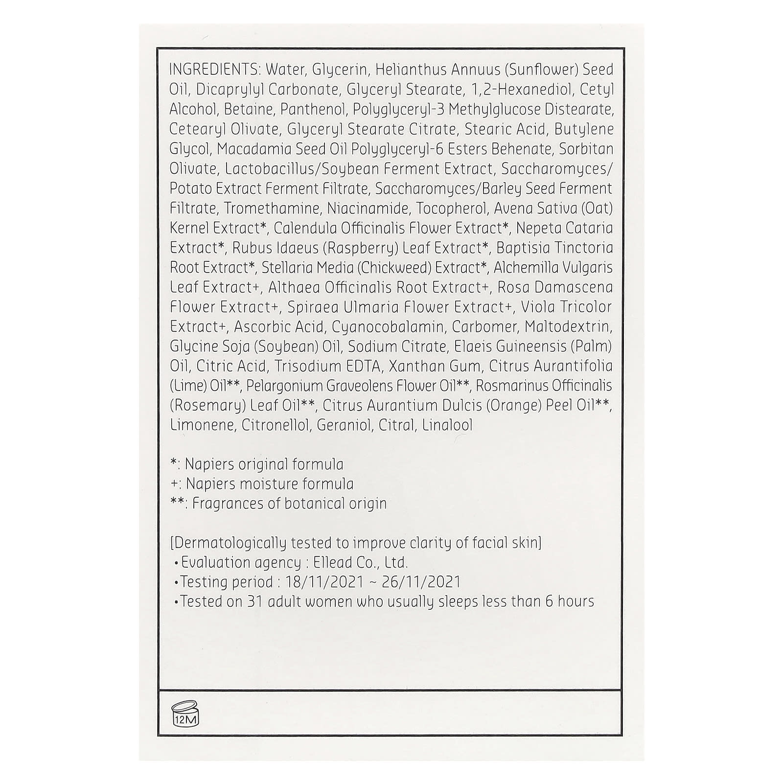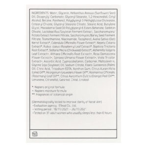 Água, glicerina, óleo da semente de Helianthus annuus (girassol), carbonato de dicaprílico, monoestearato de glicerila, 1,2-hexanediol, álcool cetílico, betaína, pantenol, diestearato de metilglicose de poliglicerila-3, estearil olivate, citrato de monoestearato de glicerila, ácido esteárico, butilenoglicol, óleo da semente de macadâmia, behenate, ésteres poliglicerila-6, sorbitano olivate, extrato de fermentação de soja/lactobacillus, Filtrado de fermentação do extrato de batata/saccharomyces, Filtrado de fermentação da semente de cevada/Saccharomyces, trometamol, nicotinamida, tocoferol, extrato de Avena sativa (aveia)*, extrato da flor de Calendula officinalis*, extrato de Nepeta cataria*, extrato da folha de Rubus idaeus (framboesa)*, extrato da raiz de Baptisia tinctoria*, extrato de Stellaria media (Morugem)*, extrato da folha de Alchemilla vulgaris+, extrato da raiz de Althaea officinalis+, extrato da flor de Rosa damascena+, extrato da flor de spiraea ulmaria+, extrato de Viola tricolor+, ácido ascórbico, cianocobalamina, carbômer, maltodextrina, óleo de Glycine soja (soja), citrato de sódio, óleo de Elaeis guineensis (palma), ácido cítrico, edetato trissódico, goma xantana, óleo de Citrus aurantifolia (limão-taiti)**, óleo da flor de Pelargonium graveolens**, óleo da folha de Rosmarinus officinalis (alecrim)**, óleo da casca de Citrus aurantium dulcis (laranja)**, limoneno, citronelol, o geraniol, citral, linalol.