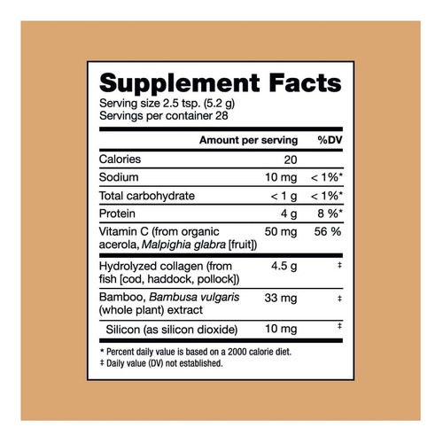• [APOIO] Esta formulação especializada não só promove a síntese de colágeno, mas também nutre a saúde dos cabelos e das unhas. A inclusão de silício proveniente de bambu integral fortalece cabelos e unhas, contribuindo para sua resiliência e vitalidade. Além disso, acredita-se que o silício otimiza a formação de colágeno, melhorando a integridade estrutural e a elasticidade da pele.