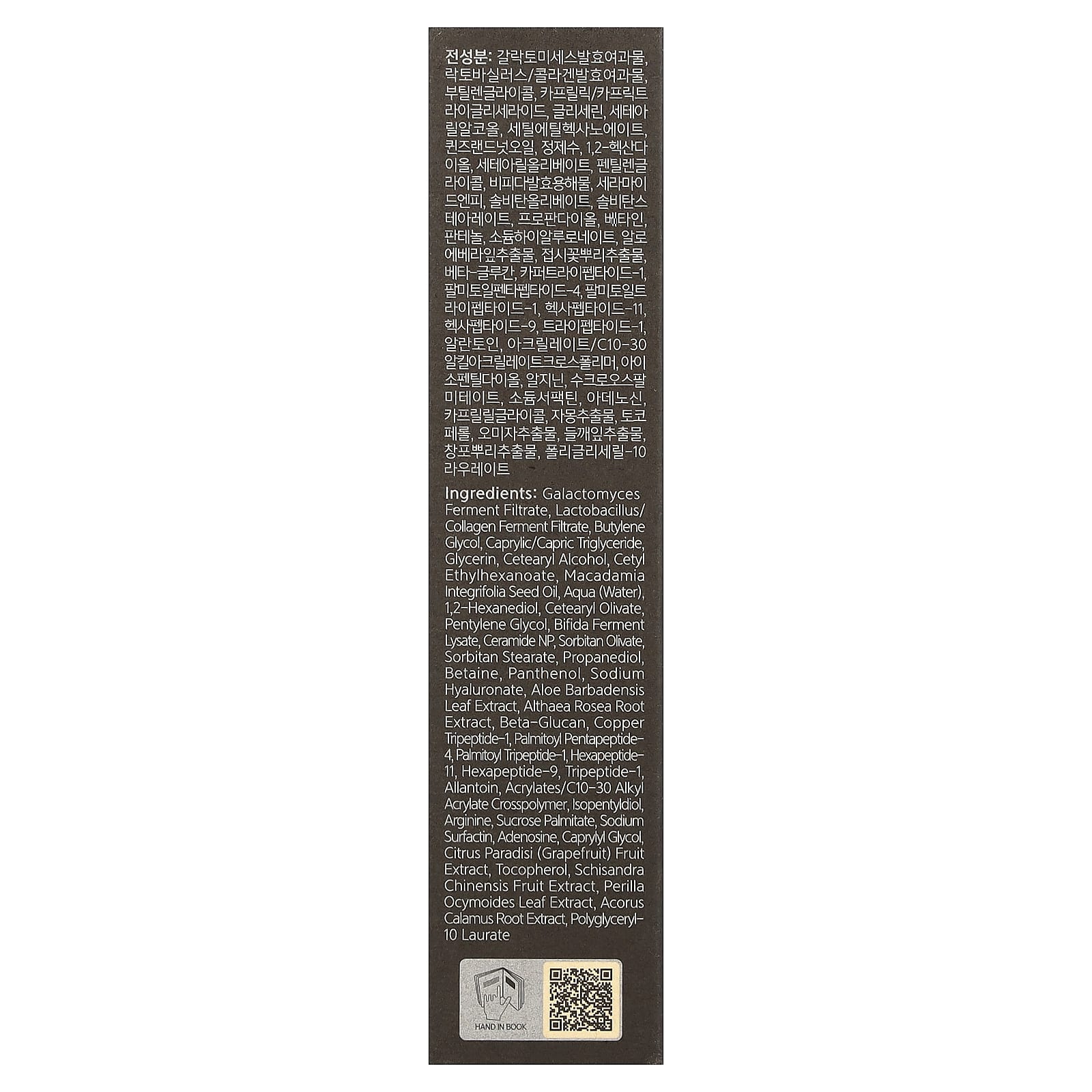 Filtrado da fermentação de Galactomyces, filtrado de fermentação de lactobacillus/colágeno, butilenoglicol, caprylic/capric triglyceride, glicerina, álcool cetoestearílico, etilcaproato de cetila, óleo da semente de Macadamia integrifolia, aqua (água), 1,2-hexanediol, cetearyl olivate, pentilenoglicol, lisado do fermento de bífida, ceramida NP, sorbitan olivate, estearato de sorbitana, propanediol, betaína, pantenol, hialuronato de sódio, extrato da folha de Aloe barbadensis, extrato da raiz de Althaea rosea, betaglucano, tripeptídeo-1 de cobre, palmitoil pentapeptídeo- 4, palmitoyl tripeptide-1, hexapeptídeo- 11, hexapeptide-9, tripeptide-1, alantoína, acrylates/c10-30 alkyl acrylate crosspolymer, isopentilodiol, arginina, palmitato de sacarose, surfactina sódica, adenosina, caprylyl glycol, extrato da fruta de Citrus paradisi (toranja rosa), tocoferol, extrato da fruta de Schisandra chinensis, extrato da folha de Perilla ocymoides, extrato da raiz de Acorus calamus, laurato de poliglicerila-10.