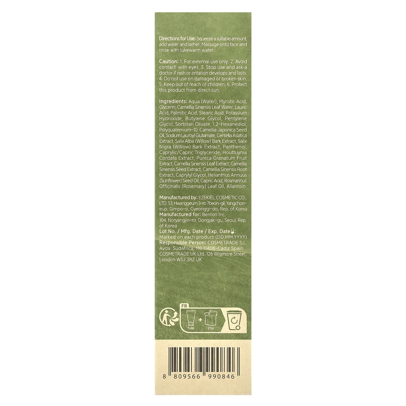 Aqua (água), glicerina de ácido mirístico, água da folha de Camellia sinensis, ácido láurico, ácido palmítico, ácido esteárico, hidróxido de potássio, butilenoglicol, pentilenoglicol, sorbitan olivate, 1,2-hexanediol e Poliquatérnio-10, óleo da semente de Camellia japonica, sodium lauroyl glutamate, extrato de Centella asiatica, extrato da casca de Salix alba (salgueiro), extrato da casca de Salix nigra (salgueiro), pantenol caprylic/capric triglyceride, extrato de Houttuynia cordata, extrato da fruta de Punica granatum, extrato da folha de Camellia sinensis, extrato da semente de Camellia sinensis, extrato da raiz de Camellia sinensis, caprylyl glycol, óleo da semente de Helianthus annuus (girassol), ácido cáprico, óleo da folha de Rosmarinus officinalis (alecrim), alantoína.