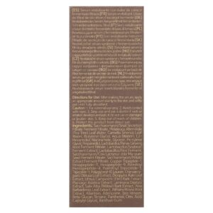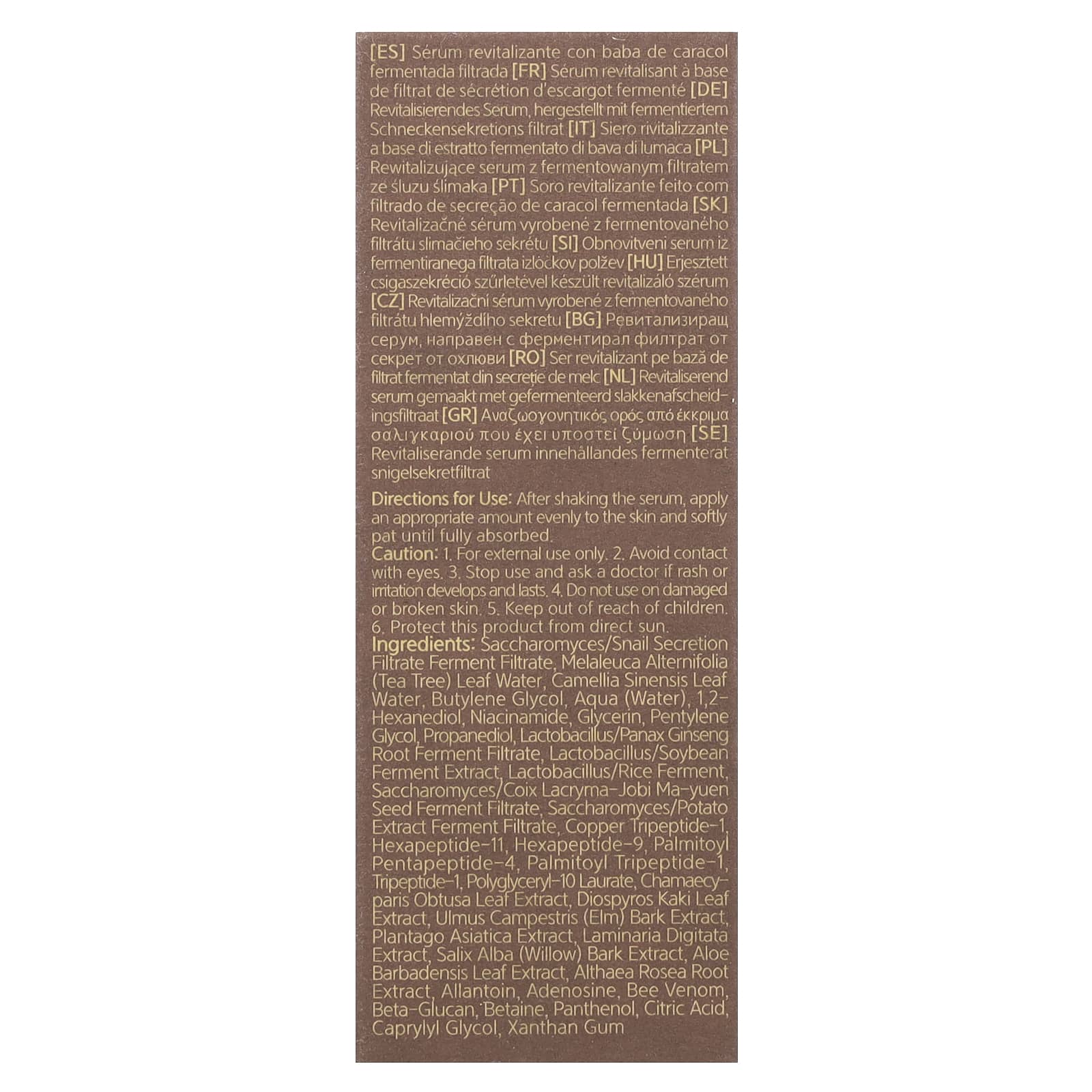 Saccharomyces/filtrado de fermentação de secreção de caracol, água da folha de Melaleuca alternifolia (melaleuca), água da folha de Camellia sinensis, butilenoglicol, aqua (água), 1,2-hexanediol, nicotinamida, glicerina, pentilenoglicol, propanediol, lactobacillus/filtrado de fermentação da raiz de Panax ginseng, extrato de fermentação de soja/lactobacillus, lactobacillus/fermento de arroz. filtrado de fermentação da semente de ma-yuen/Saccharomyces/coix lacryma-jobi, filtrado de fermentação do extrato de batata/saccharomyces, tripeptídeo-1 de cobre e hexapeptídeo-11, hexapeptide-9, palmitoyl pentapeptide-4, palmitoyl tripeptides-1 tripeptídeos-1, polyglyceryl-10 laurate, extrato da folha de Chamaecyparis obtusa, extrato da folha de Diospyros kaki, extrato da casca de Ulmus campestris (olmo) extrato de Plantago asiatica, extrato de Laminaria digitata, extrato da casca de Salix alba (salgueiro), extrato da folha de Aloe barbadensis, extrato da raiz de Althaea rosea, alantoína, adenosina, veneno de abelha, betaglucano, betaína, pantenol, ácido cítrico, caprylyl glycol, goma xantana.